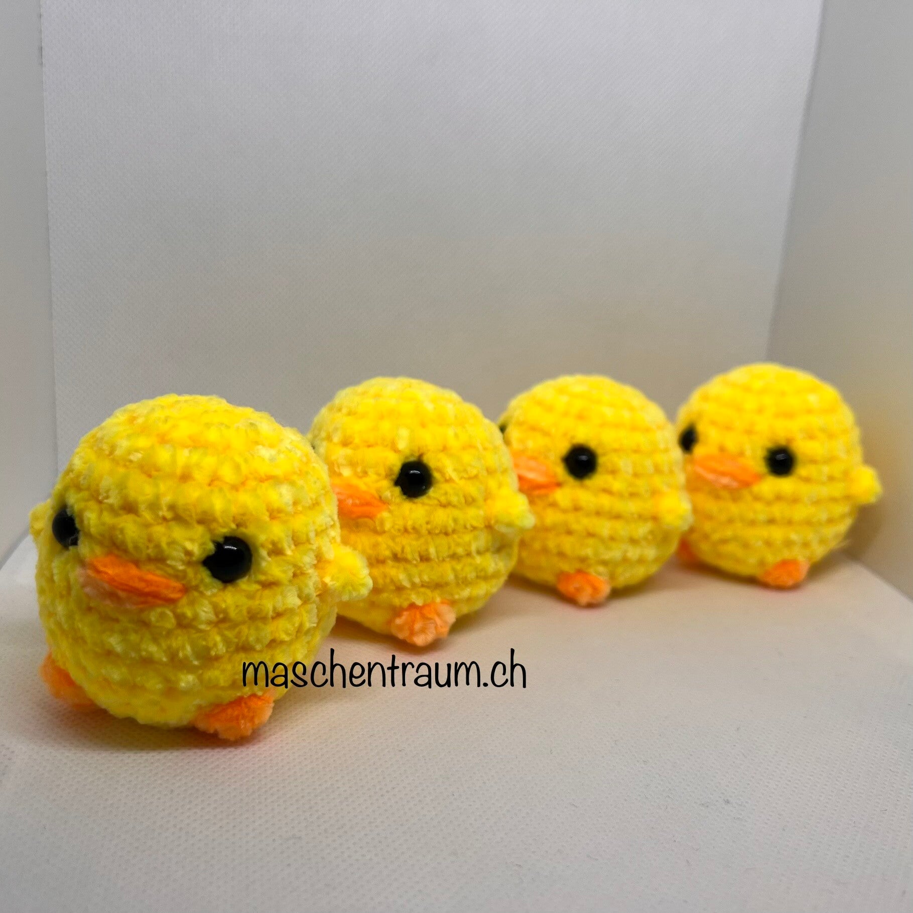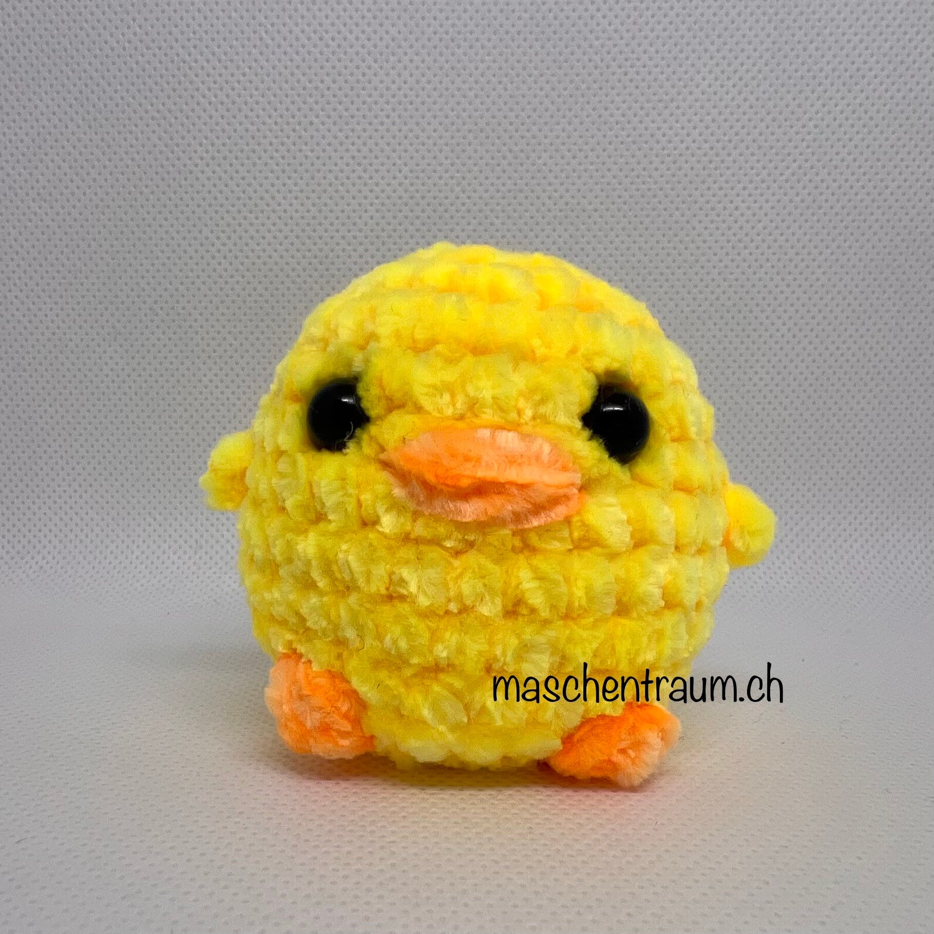 Ein kleines Küken aus Chenillewolle gehäkelt.