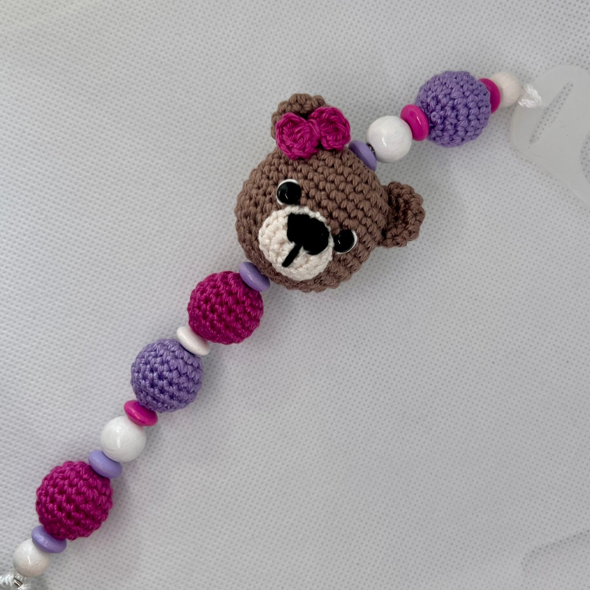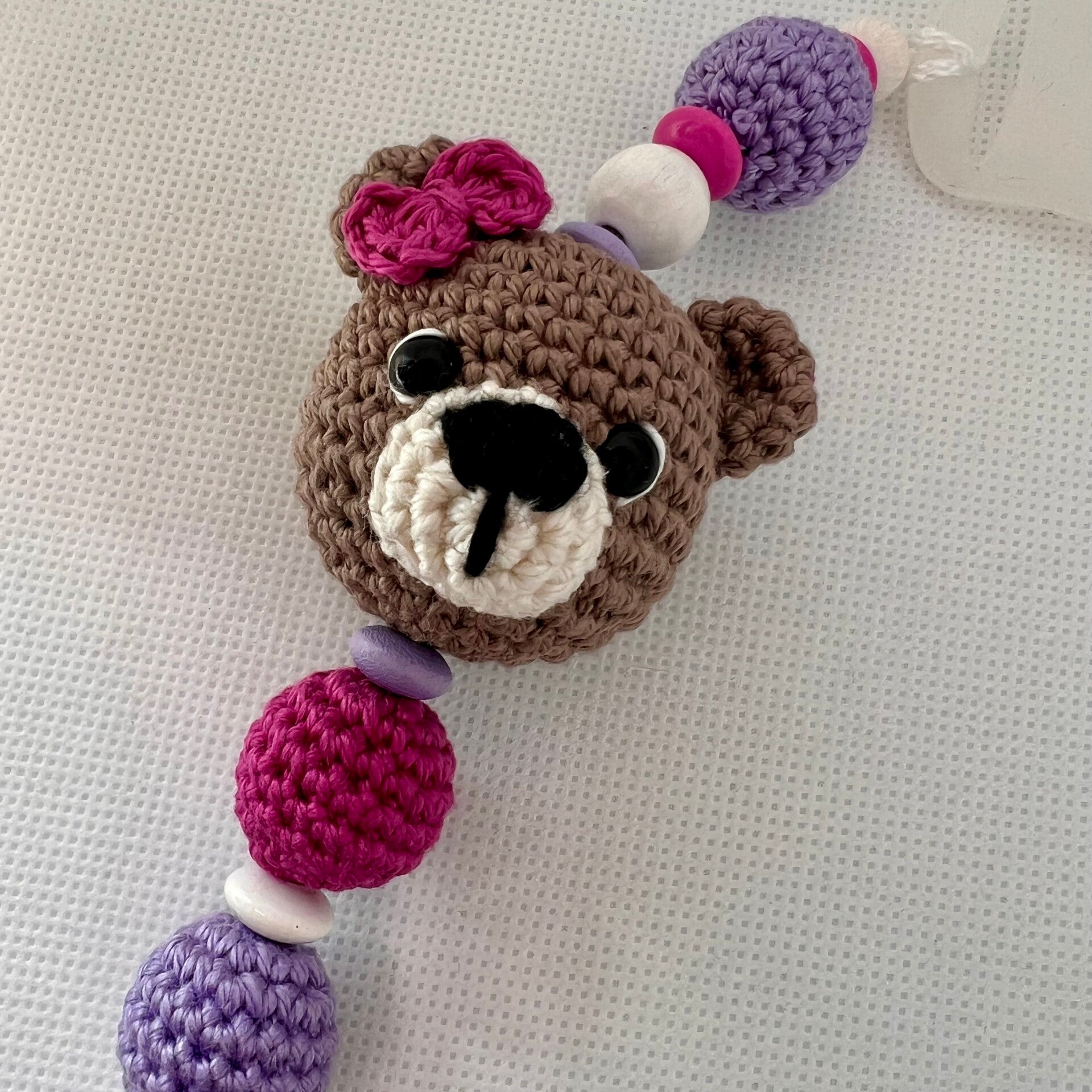 Nuggikette mit einem Bärenkopf und süsser Haarschleife. Dazu passende Holzperlen, Silikonclip und umhäkelte Holzperlen.